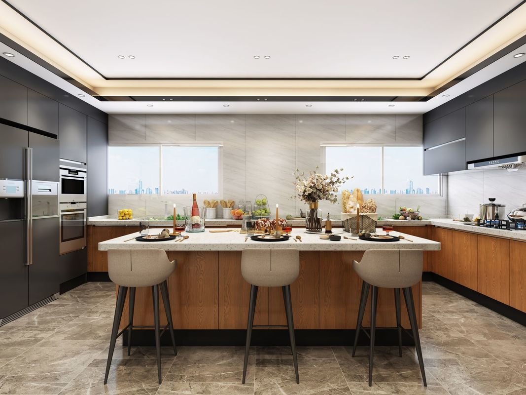 Lemari dapur kustom ini dibangun di atas strategi finishing yang berbeda: Serat Kayu dipadukan dengan struktur kabinet Baja Tahan Karat. Kombinasi tersebut memberikan ekspresi kemewahan yang lebih hangat kepada pembeli tanpa kehilangan kebersihan dan daya tahan proyek yang diharapkan dari lemari baja tahan karat.