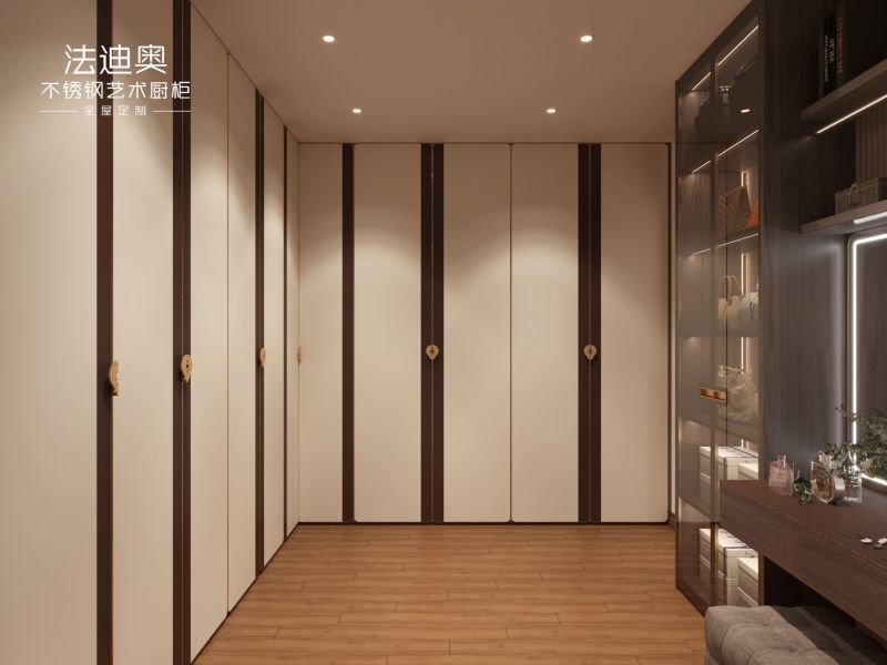 Lemari pakaian khusus ini dibangun di sekitar strategi akhir yang berbeda: Beige dipasangkan dengan struktur kabinet stainless steel.Kombinasi ini memberikan pembeli ekspresi mewah yang lebih hangat tanpa kehilangan kebersihan dan daya tahan proyek yang diharapkan dari kabinet baja tahan karat.