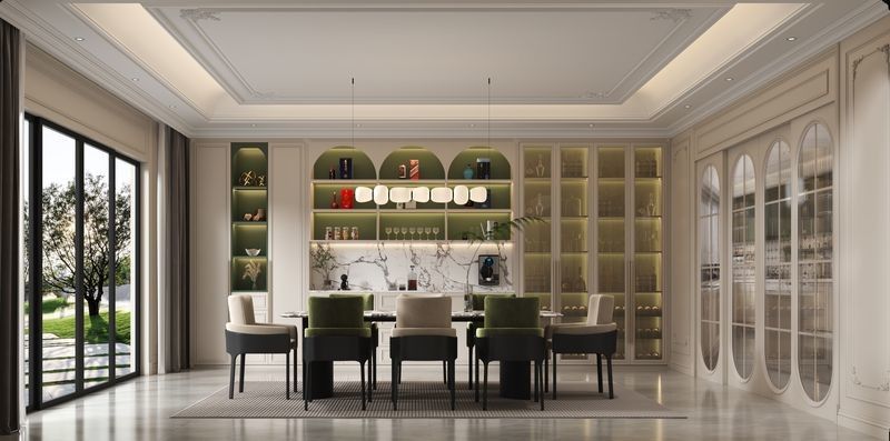 | Panel Kaca | Kaca tertanam di lemari tinggi sisi kanan, menampilkan bagian belakang bertekstur hijau zaitun. |