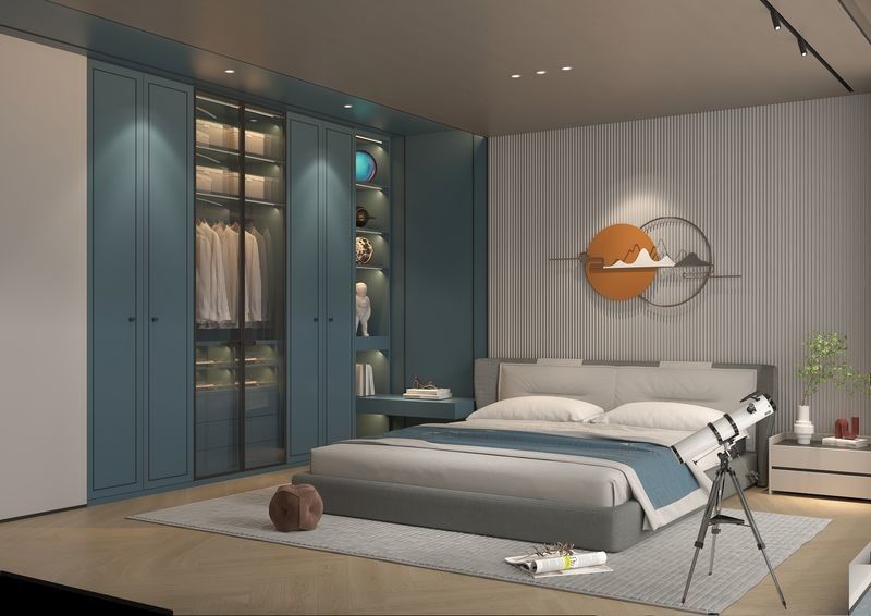 Lemari ini mencakup bagian gantung dan rak, menyediakan penyimpanan yang cukup untuk pakaian, sepatu, dan Bebas Formaldehida adalah bagian dari komposisi yang sama, yang membantu desainer dan pengembang menilai bagaimana sistem akan terlihat setelah peralatan, meja, dan pencahayaan terpasang.