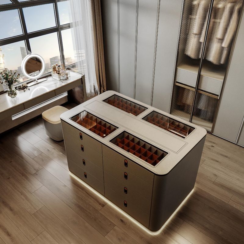 | Penyimpanan Pulau | Pulau kaca bagian tengah dengan kompartemen yang terbagi-bagi untuk perhiasan, jam tangan, dan aksesori |