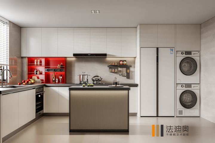 Lemari dapur ini disajikan sebagai sistem yang dipimpin desain daripada SKU generik. Lemari ini menggunakan struktur kabinet Putih bersama dengan Baja Tahan Karat untuk menciptakan identitas visual yang lebih matang untuk proyek residensial premium.