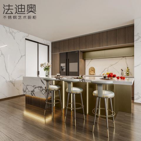 Lemari dapur ini disajikan sebagai sistem yang dipimpin desain daripada SKU generik. Lemari ini menggunakan Warna Kayu bersama dengan struktur kabinet Baja Tahan Karat untuk menciptakan identitas visual yang lebih matang untuk proyek residensial premium. Perencanaan berpusat pada pulau dan Bebas Formaldehida adalah bagian dari komposisi yang sama, yang membantu desainer dan pengembang menilai bagaimana sistem akan terlihat setelah peralatan, meja, dan pencahayaan terpasang.