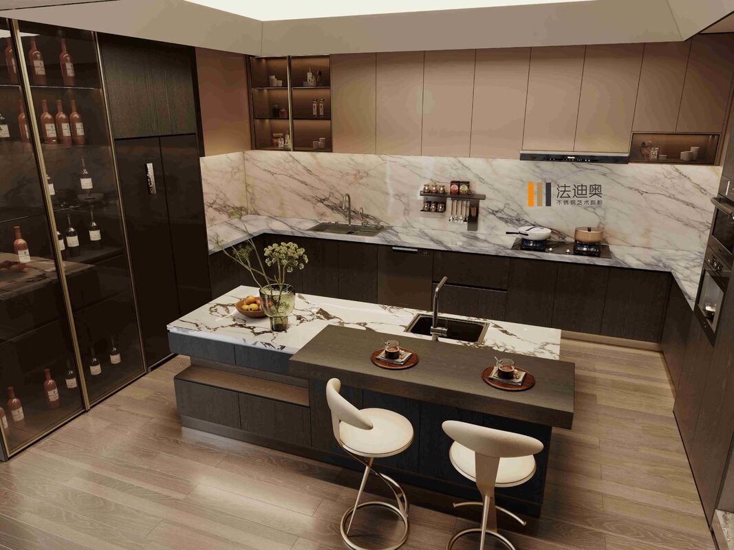 | T: Mengapa Lemari Dapur Baja Tahan Karat Modern Mewah Penyimpanan Anggur Terintegrasi ini menggabungkan abu-abu / champagne dengan struktur baja tahan karat? Nilainya adalah abu-abu / champagne memberikan identitas visual yang lebih hangat dan lebih residensial pada proyek, sementara struktur kabinet Baja Tahan Karat membuat sistem kabinet mudah dirawat dan lebih kredibel untuk penggunaan jangka panjang. |
