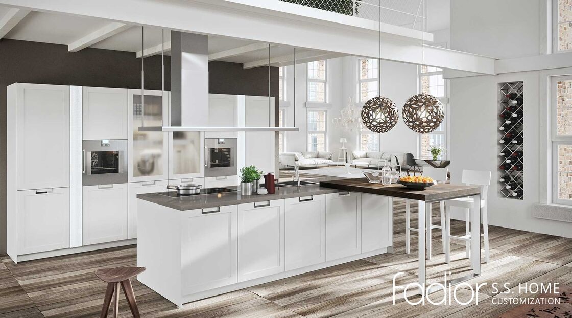 Bright white cabinetry and clean architectural lines define this modern kitchen by Fadior. Inspired by contemporary loft interiors, the design emphasizes openness, light, and spatial balance. The central island combines a durable preparation surface with an extended breakfast bar, creating a multifunctional hub for cooking, dining, and social interaction. Built on Fadior’s precision stainless steel cabinet framework, the kitchen delivers superior resistance to moisture, heat, and daily wear. Integrated appliances, concealed storage, and minimalist panel doors maintain a seamless appearance while ensuring long-term durability and effortless maintenance.