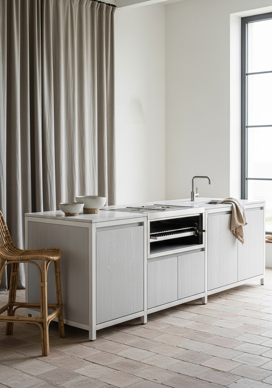 | Usage | Primary outdoor kitchen island for residential terraces, pool houses, coastal properties, and garden pavilions; designed for integrated grills, refrigeration, and open-air dining |