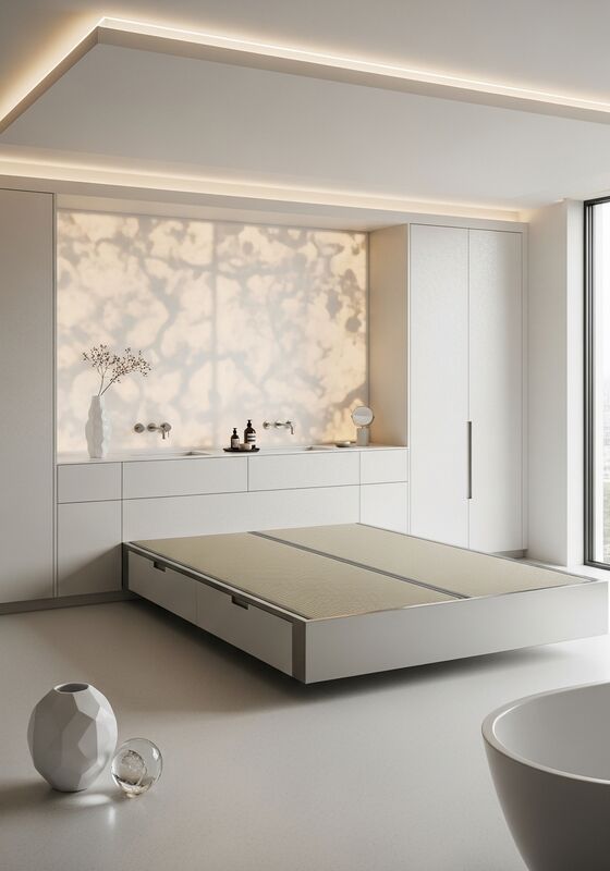 | Sorotan DesainMinimalisme ringan dengan ilusi kedalaman reflektif, konstruksi monolitik yang mulus, arah sistem pencahayaan internal dengan dominan putih mutiara dengan panel aksen stainless steel cermin,cahaya translucent amber-putih sekitar, permukaan putih yang mulus, proporsi yang disiplin, dan panel headboard stainless steel yang dipoles cermin menciptakan kedalaman spasial melalui refleksi yang terkontrol.Halaman harus dibaca sebagai spesifikasi yang diselesaikan, bukan kotak penyimpanan umum. |