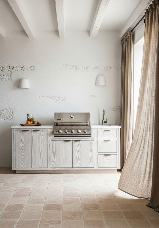 | Bahan & KinerjaKerangka struktural baja tahan karat 304 dengan panel baja berlapis bubuk dengan finishing abu putih; countertop batu kapur alami yang diasah;Hardware baja tahan karat 316 kelas laut mendukung ketahanan kelembaban, stabilitas akhir, dan penggunaan sehari-hari jangka panjang di dapur luar rumah, rumah kolam renang, villa pantai, teras atap, paviliun makan di luar ruangan.Itu penting ketika pembeli membutuhkan penampilan arsitektur tanpa risiko pemeliharaan berbasis kayu. |